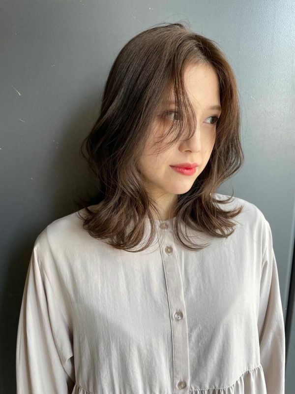 人気の外ハネくびれのミディアムと柔らかいミルクティーベージュが相性ぴったり。