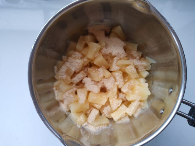 ① 鍋に細かくカットしたパイナップルを入れ、砂糖を25g加え、弱火で煮詰める。