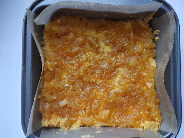 ⑤ 生地の半分を型に入れ、冷ましておいたパイナップルジャムをおく。