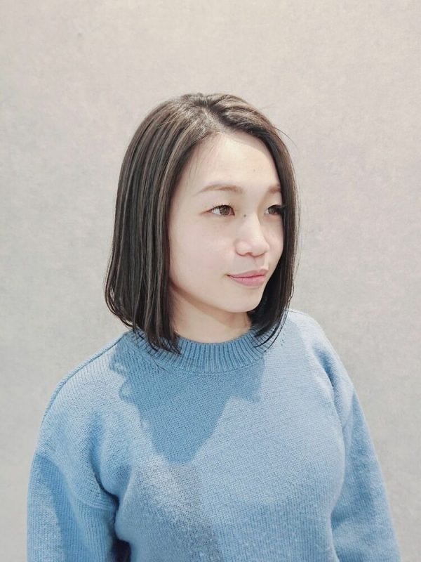 柔らかいオリーブグレージュで切りっぱなしボブが重くならず軽やかさがアップ。