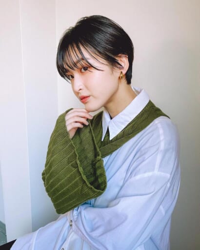 丸みシルエットで仕上げたショートヘアも毛先をシャープに仕上げるだけで、ほんのりクールな雰囲気のスタイルに仕上がります。