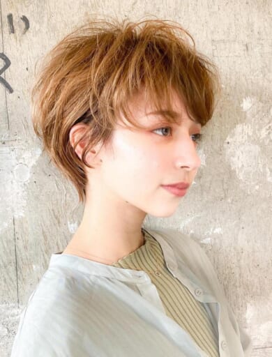 透け感のある長めの前髪を残して全体に柔らかくボリューム感を出しつつ耳を覗かせたスタイルは愛らしさたっぷり。あご周りや首元がスッキリ見えるので、小顔効果も抜群です。スタイリング剤を全体にもみ込んでラフにセットするだけで、さり気なくリラックスした印象を醸す好印象なスタイルに仕上がります。