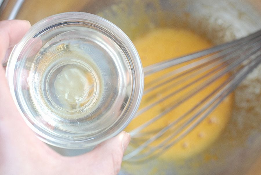 ② サラダ油を少しずつくわえながら泡立て器でよく混ぜる。