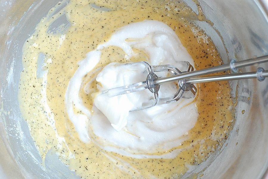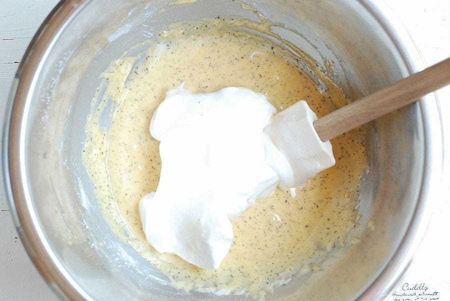 ⑥ ③に⑤のメレンゲをひとすくい加え、泡立て器の羽根でよく混ぜメレンゲを生地になじませる。