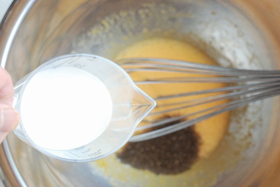 ③ 茶葉を加え牛乳を少しずつ加えながら泡立て器でまぜる。