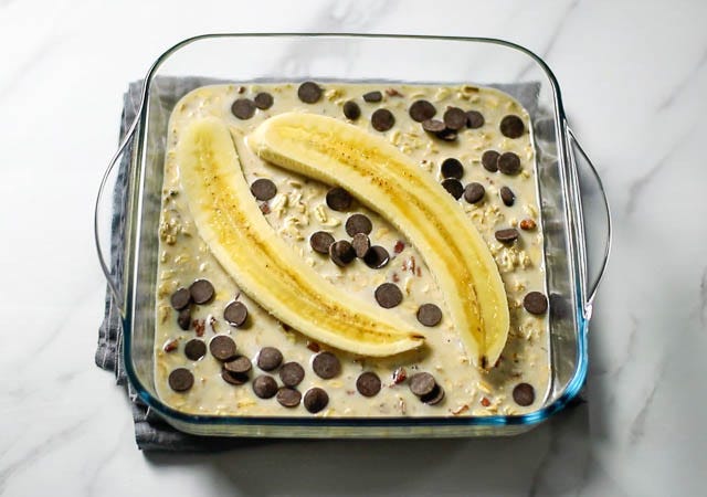 ③ 型に注ぎ入れます。バナナを縦半分に切って生地の上に置き、チョコレートチップをトッピングします。