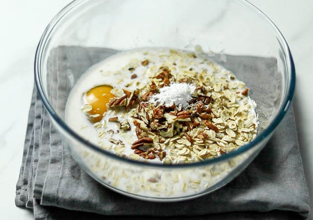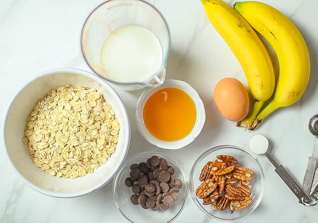 基本的な材料はオートミール、牛乳、甘味料、ベーキングパウダー。ここにリンゴ、バナナ、ベリー類などの果物を加えたりナッツ類を加えたりしてアレンジします。
