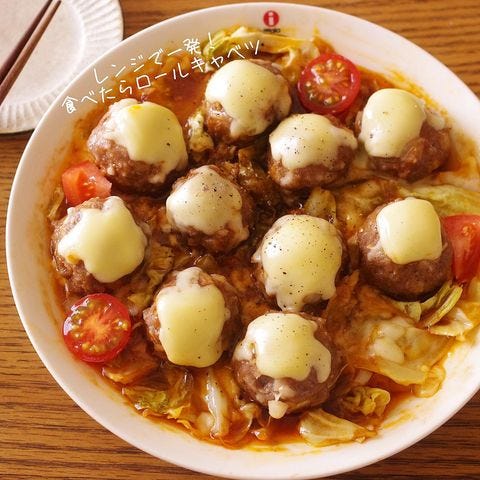 耐熱容器にキャベツを敷き、その上にひき肉や玉ねぎ、調味料を混ぜて丸く成形したタネを並べて電子レンジで加熱すれば完成。