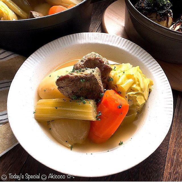 牛肉、キャベツ、にんじん、セロリ、玉ねぎ、じゃがいもなど好きな具材を入れて煮込み、軽く味付けするだけなので煮込み時間はかかりますが手間はかかりません。