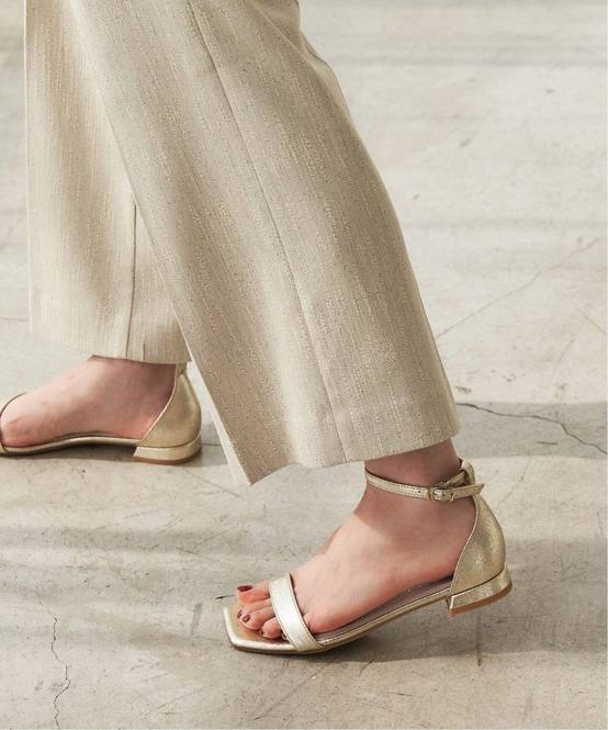 夏コーデにぐっと重厚感が出る、ゴールドのストラップサンダル。上品な風合いが、大人の女性らしさを醸し出します。