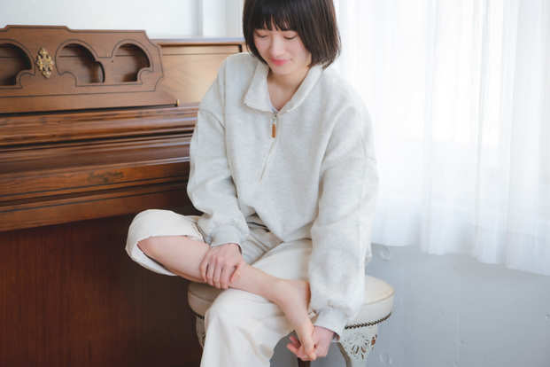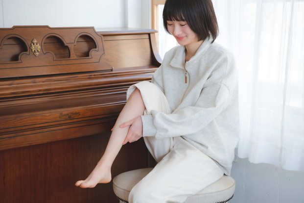「指を大きく動かしたり普段しない動きをすると血行が良くなってスッキリする! 他には足首を回したり、特に決まったマッサージをするのではなく自然に動かしています。お風呂上りにボディクリームを塗って脚全体をケアする日もあるよ!」。