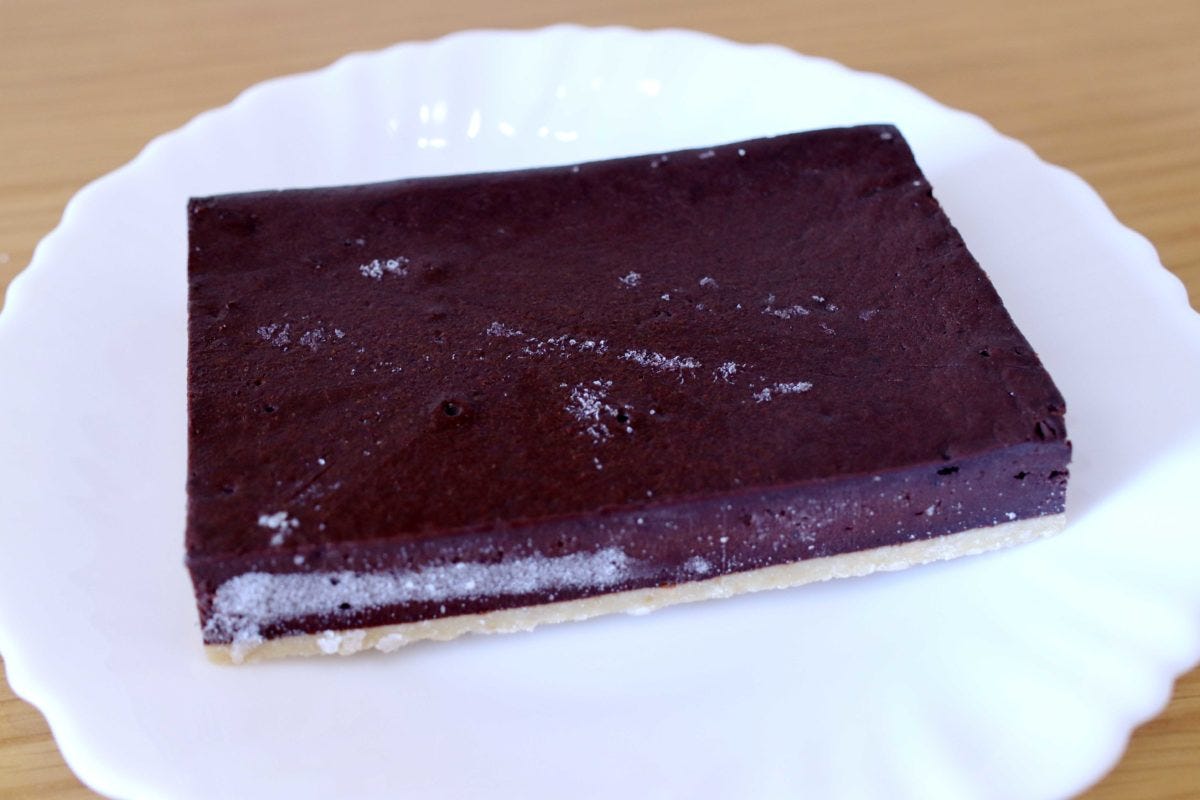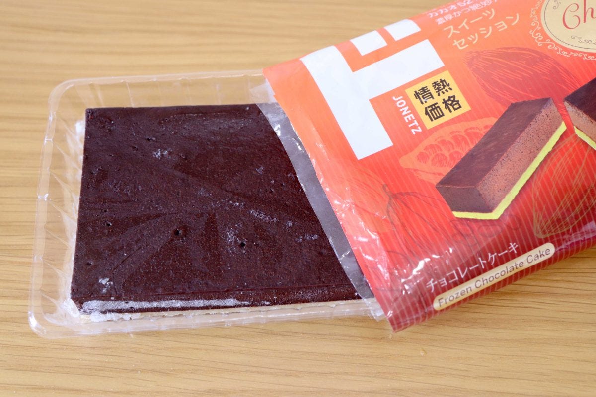 こちらは、シンプルな“正統派”「チョコレートケーキ」。本来は冷蔵庫で1〜2時間解凍して食べるのだが、冷凍庫から取り出してすぐに開けてしまったため少し霜がついている。