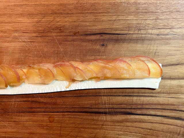 ② 半解凍にした冷凍パイシートを、長く6等分にカットします。パイシートをめん棒で1.5倍の長さに伸ばし、①のりんごをパイシートの上に少しずつずらして重ねて並べ、くるくる巻き取ります。