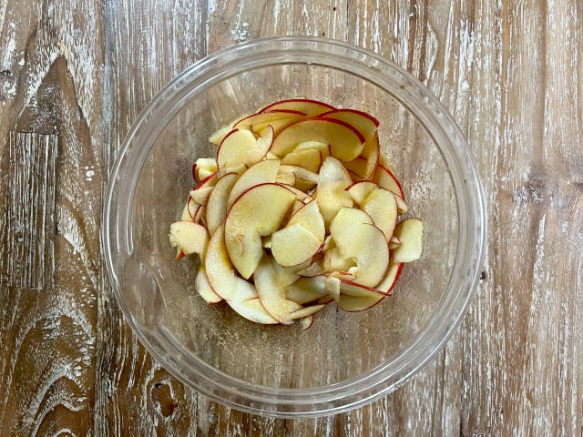 ① りんごは種の部分を切り取り、1.5mmの薄切りにして耐熱性のボウルに入れ、グラニュー糖・メープルシロップを加えて全体に絡めます。バターを乗せて、600wのレンジで約4分りんごがしんなりするまで加熱します。