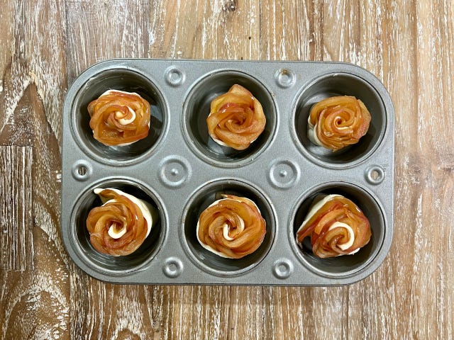 ③ マフィン型に②の巻き取ったアップルパイを入れ、予熱が完了したオーブンで15分焼成します。