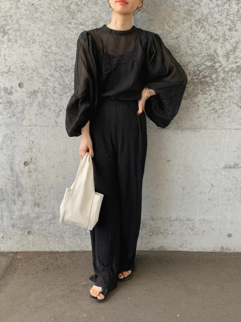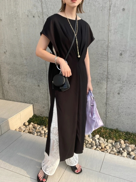 ボトムスはナローシルエットのロングスカートが好相性。黒を選べばすっきり見えて、美脚効果まで期待できます。