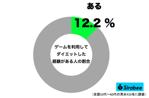 編集部が全国10〜60代の男女410名を対象に実施した調査によれば、全体で12.2%の人が「ゲームを利用してダイエットをした経験がある」と回答。