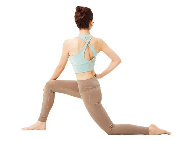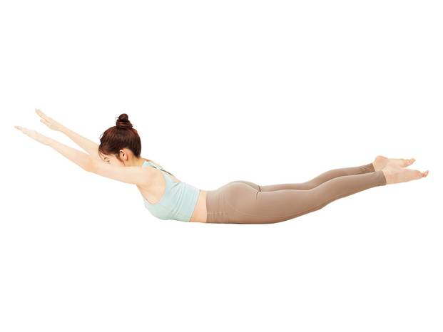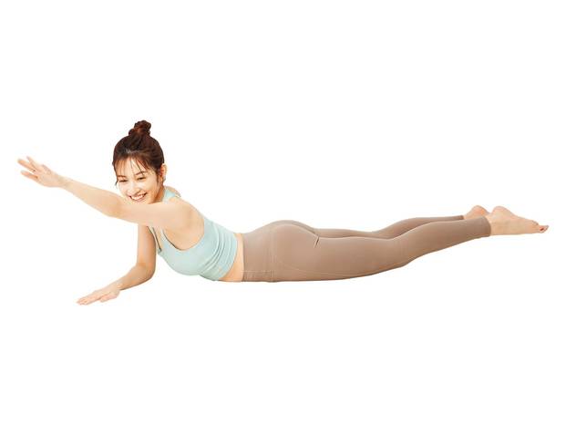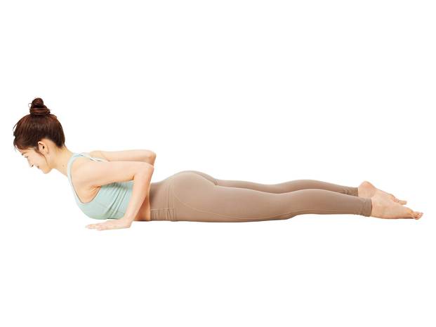 両手で床を押し、上半身を持ち上げる。恥骨は床につけ、恥骨をおへそに引き込むようにして背骨を伸ばす。