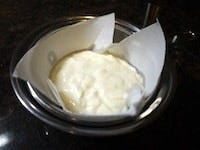 ストレイナー(ざる)にキッチンペーパーを敷き、ボウルを重ねたところにヨーグルトを入れて、水切りします。できれば冷蔵庫で半日置いておきます。