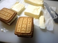 凍ったアイスクリームを取り出し、ビスケットのサイズに合わせてカットします。アイスクリームをビスケットに挟んで出来上がりです。