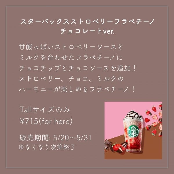 ストロベリー・チョコ・ミルクのハーモニーが楽しめるフラペチーノです。