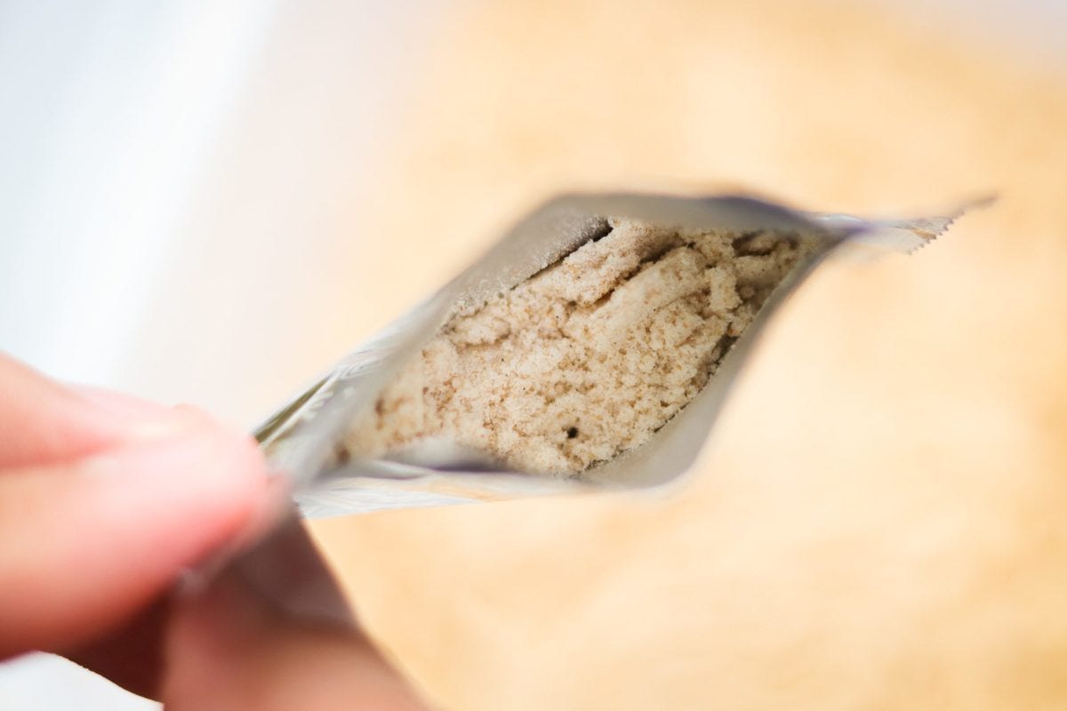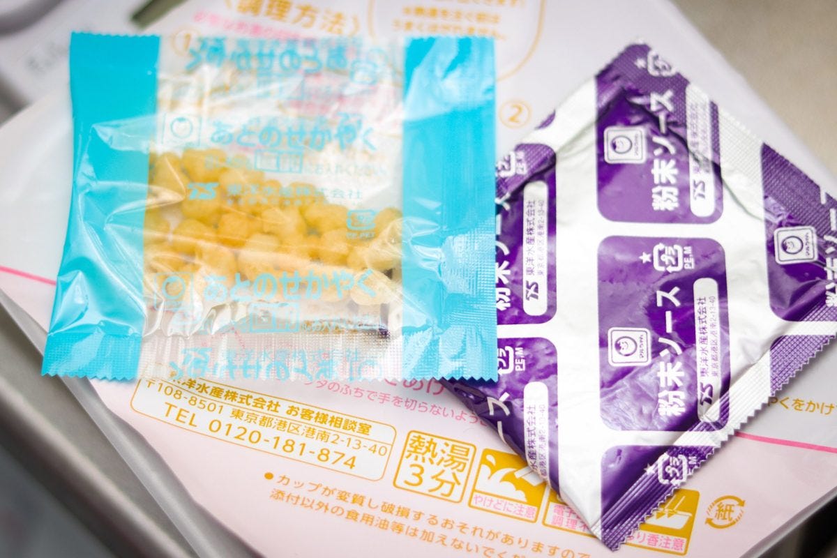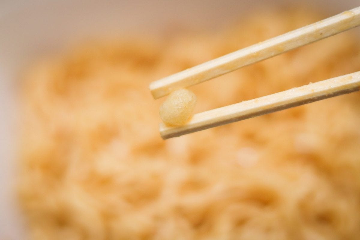 しかし、粉末ソースの香りを嗅ぐと、ハッピーターンのようなふんわりとした甘さと塩気のある香りが漂う。これは再現度が高いかもしれない。湯切りをして、粉末ソースとかやくを投入していざ実食。
