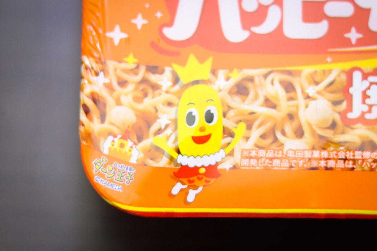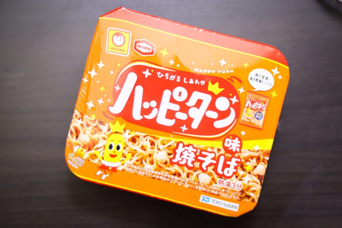 オレンジと黄色のカラーにハッピーターンの文字、この時点であの甘塩っぱ旨い味が思い出される人もいるだろう。そう、まさかの東洋水産の「マルちゃん」と亀田製菓の「ハッピーターン」がコラボした商品となっている。