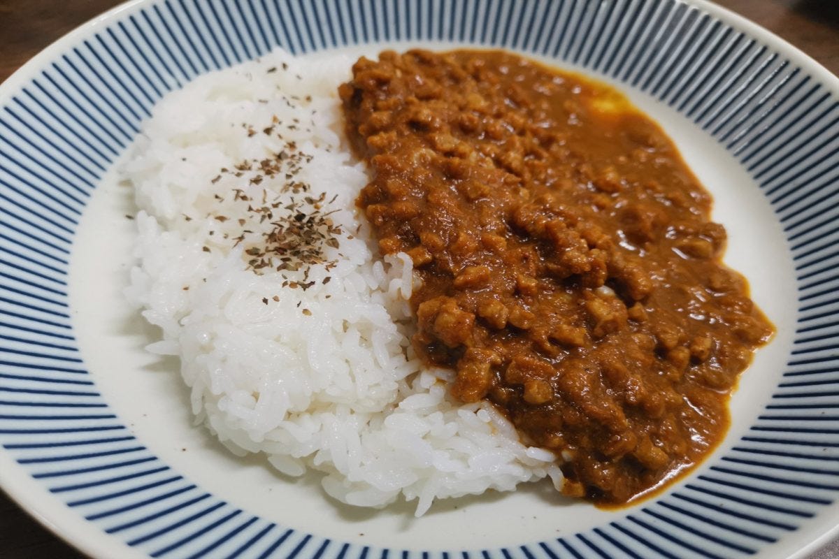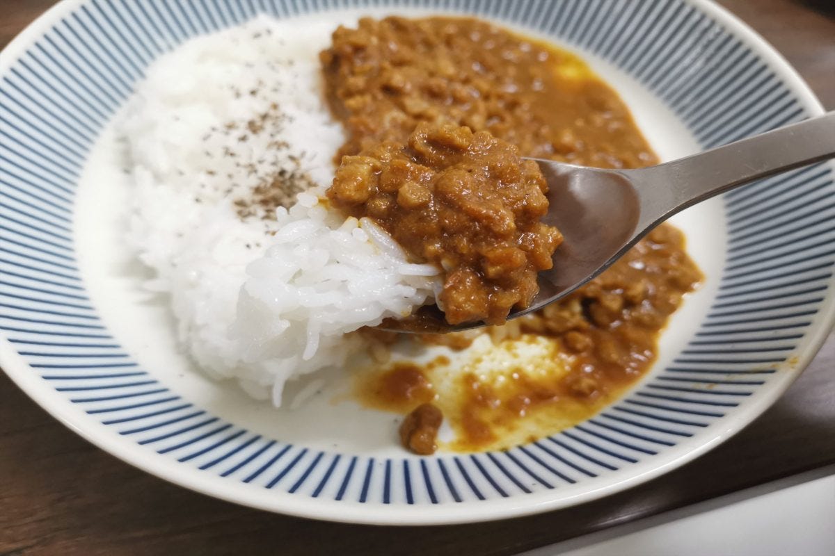 肉を入れれば仕上がるカレーキットを使ったところ、見た目は完全に普通のキーマカレーである。香りについてもスパイスの香りで大豆の香りを完全にカバーしているので、まったく気にならない。