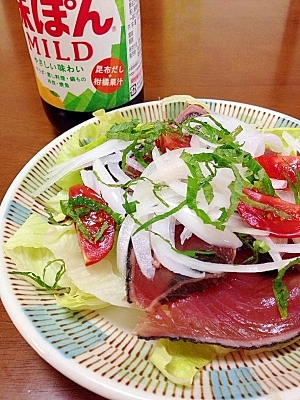 カツオのたたきをレタスと新玉ねぎと大葉と合わせてサラダ仕立てたさっぱりレシピ☆