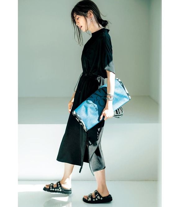 ワンピース¥80,300(ebure/ebure GINZA SIX店)ピアス¥11,000(ワンエーアールバイウノアエレ/ウノアエレ ジャパン)バッグ¥100,100 サンダル¥125,400(ともにピエール アルディ/ピエール アルディ 東京)