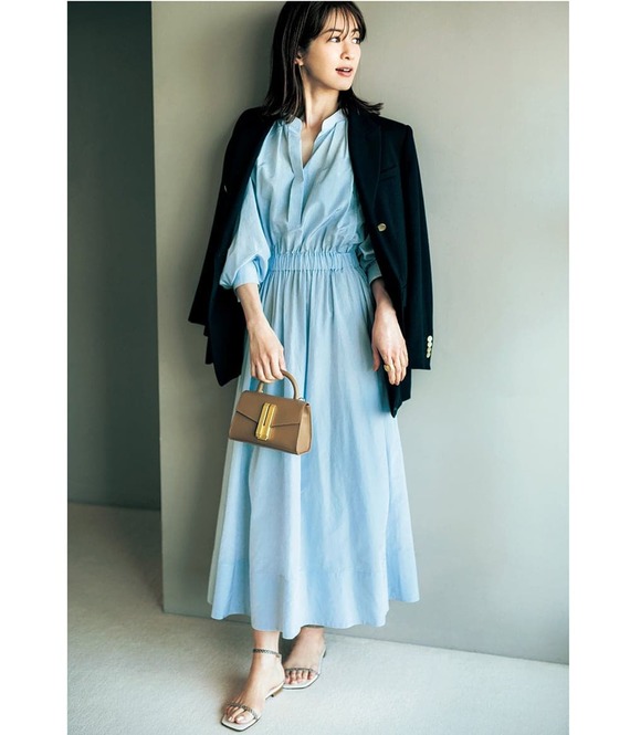 ワンピース¥19,800(ガリャルダガランテ ネイビー/ガリャルダガランテ 表参道店)ネックレス¥42,900(アダワット トゥ アレグ)バングル¥44,000(e.m./e.m. PRESSROOM)ピアス¥13,200(ウノアエレシルバーコレクション/ウノアエレ ジャパン)バッグ¥48,400(Anita Bilardi/ADORE)サンダル¥29,700(DES PRÉS/DES PRÉS)