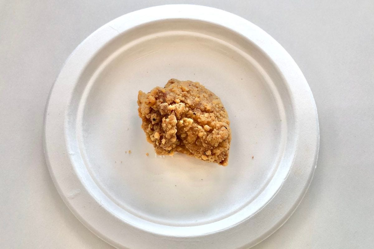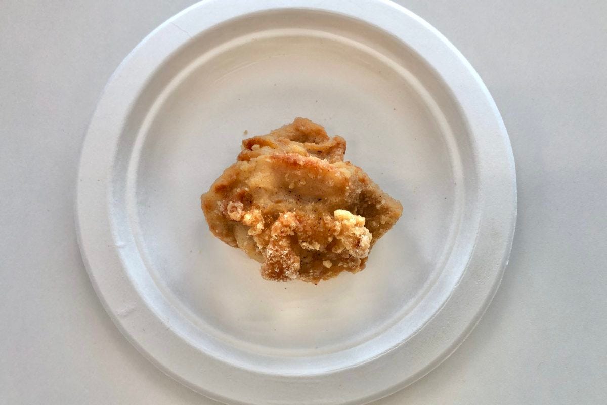 旧からあげは、1個あたり30gで作られています。厚さのある衣は、少しクリスピーチキン風です。