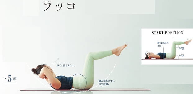 腰と股関節をつなぐ腸腰筋をメインに、胸を起こす動きで、腹膜前面にある腹直筋、その横にある腹斜筋にアプローチ。上半身と下半身をいっぺんに鍛える。