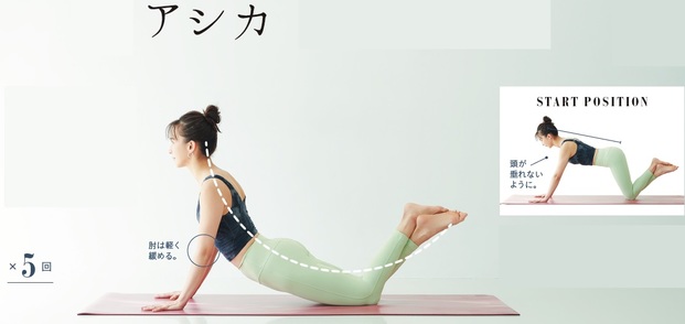体を支えるため、二の腕の引き締めに。もも裏の筋肉を強化し、ヒップアップにも。ラッコ、グラスホッパーで使ったお腹まわりの筋肉を伸ばして緩める効果にも期待。
