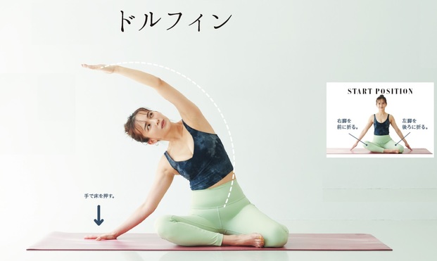 息を吸ってゆっくり吐きながら、左脚を斜め上に伸ばし、直角に曲げたままの右膝に、胸を当てるような感覚で体をひねる。息を吐き切ったら、息を吸って脚をチェンジし、逆ひねりに。両足の親指は、同じ方向を向ける。