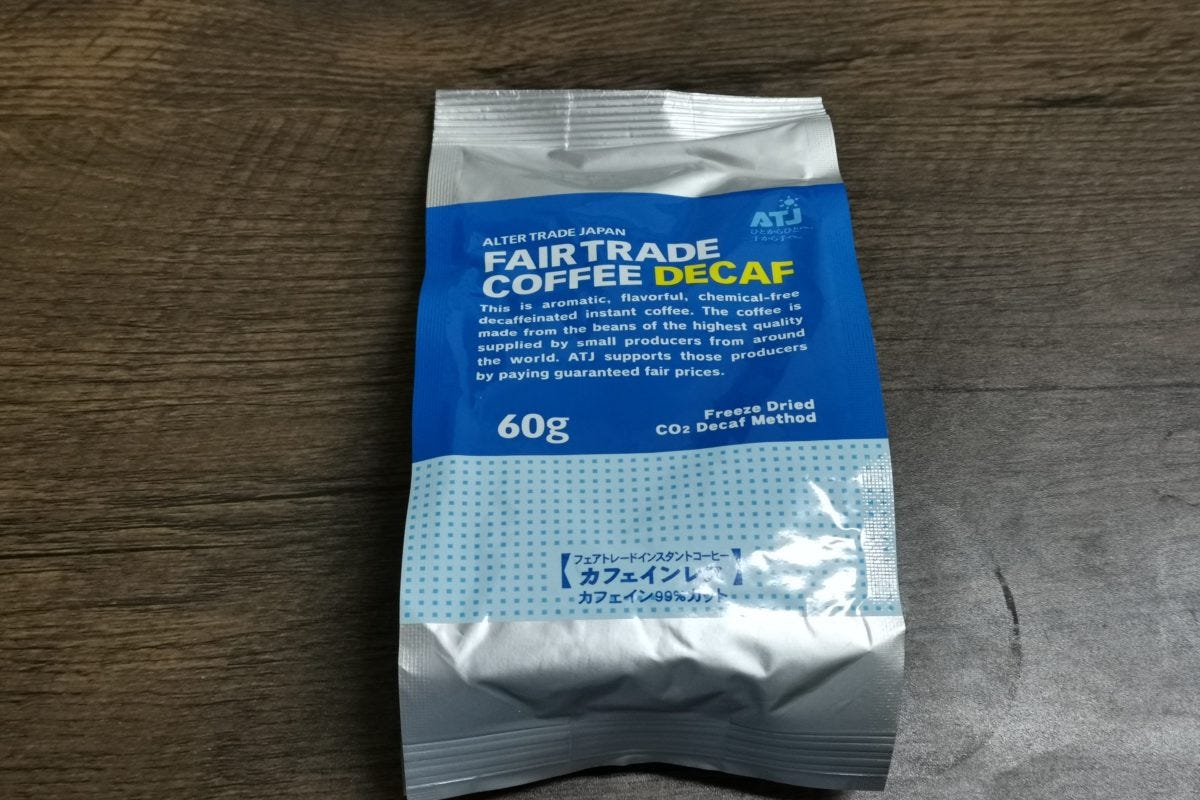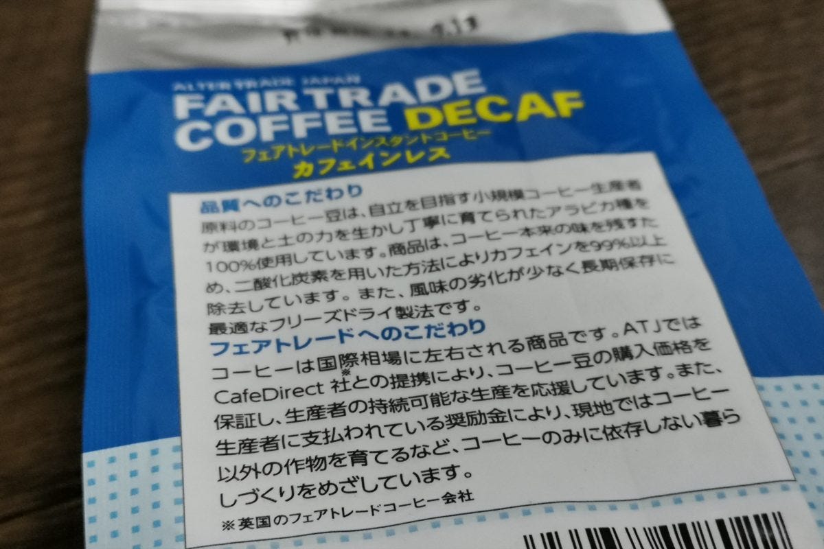 記者が手に入れたのは、Qoo10など人気の通販サイトでも売れ行き好調の「オルタートレードジャパン フェアトレード インスタントコーヒー カフェインレス」。