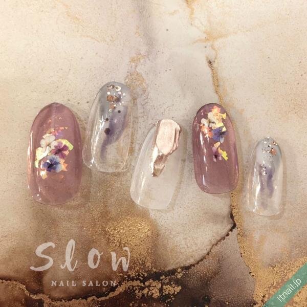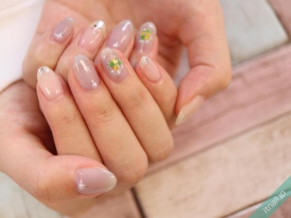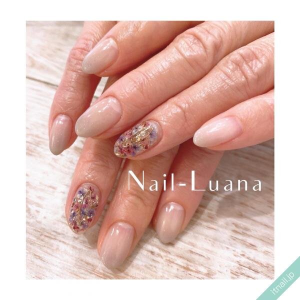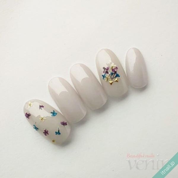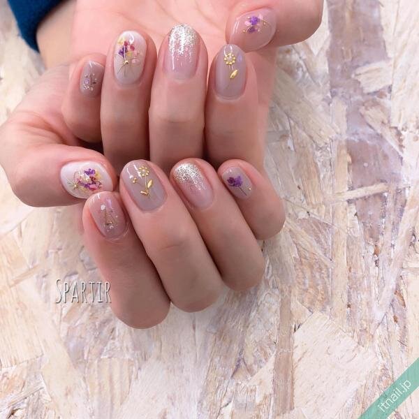 ドライフラワーを散りばめるときに、小さなシェルも使いながら散りばめていくのも素敵ですよ♪角度によってキラキラ輝くシェルが、ドライフラワーを引き立ててくれますし、立体感があるようなグレーネイルにしてくれます。