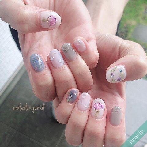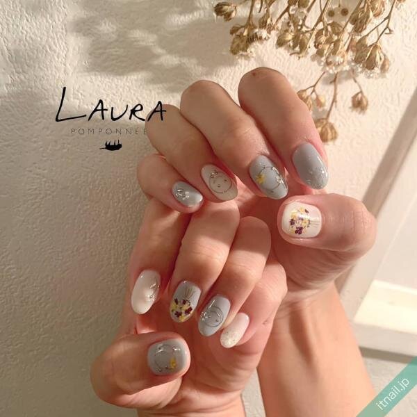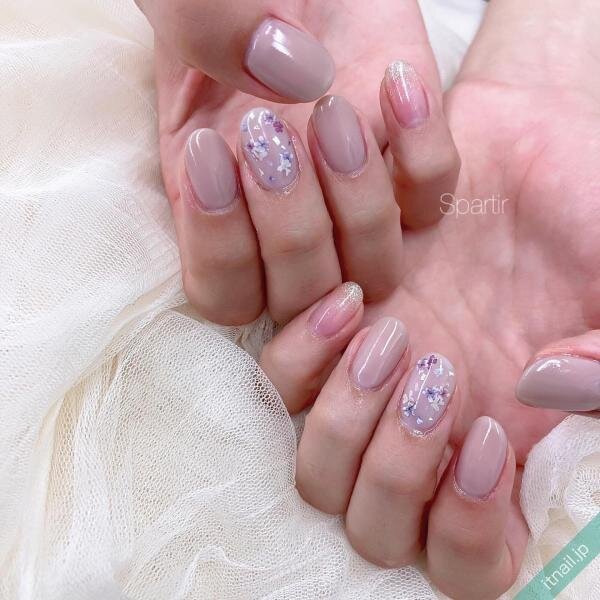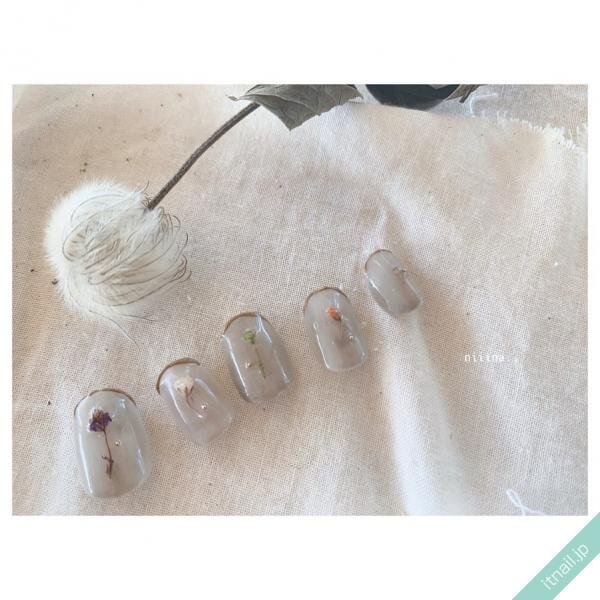 シンプルなグレーのワンカラーネイルをベースに、寒色系のドライフラワーを使えば、落ち着いた大人ネイルになります。グレーにもいろいろあるので、軽やかに見せたいときは淡いグレーや、透け感のあるグレーを使ってみて♡