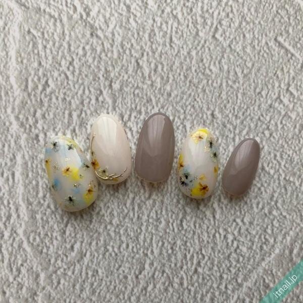 淡いグレーに、黄色のドライフラワーをのせると、柔らかくて可愛らしい仕上がりになりますが、濃いめのグレーネイルをワンポイントに入れて引き締めると、大人っぽさが増します。黄色だけでなく、あえてブルーのドライフラワーを混ぜて落ち着かせるのもGOOD♡