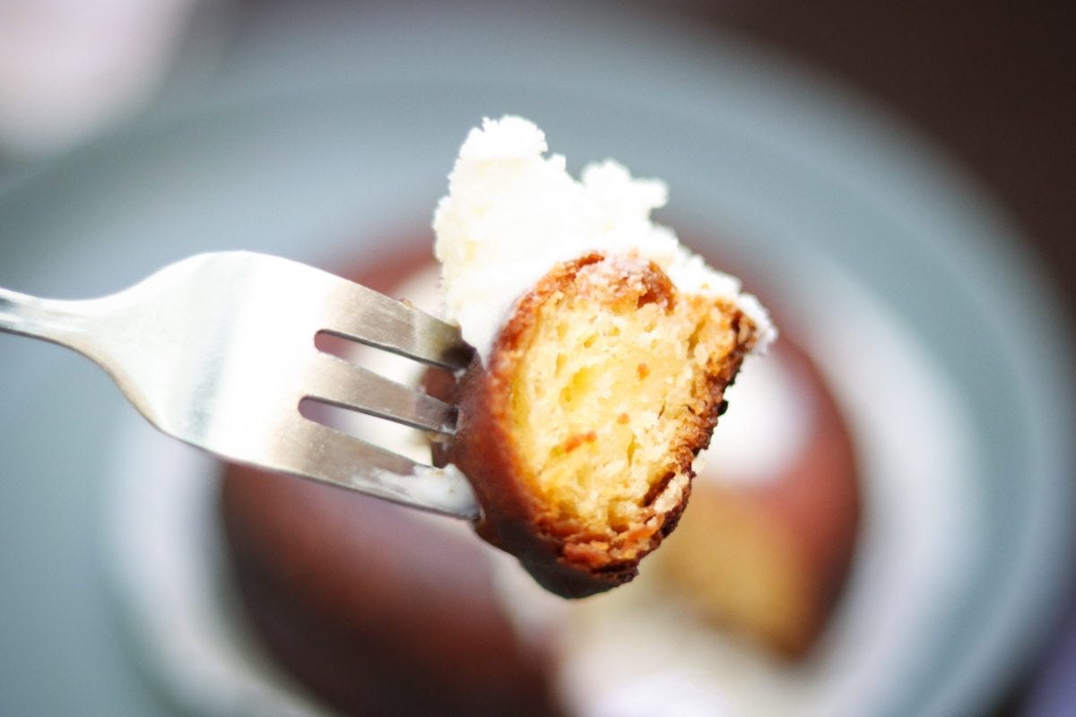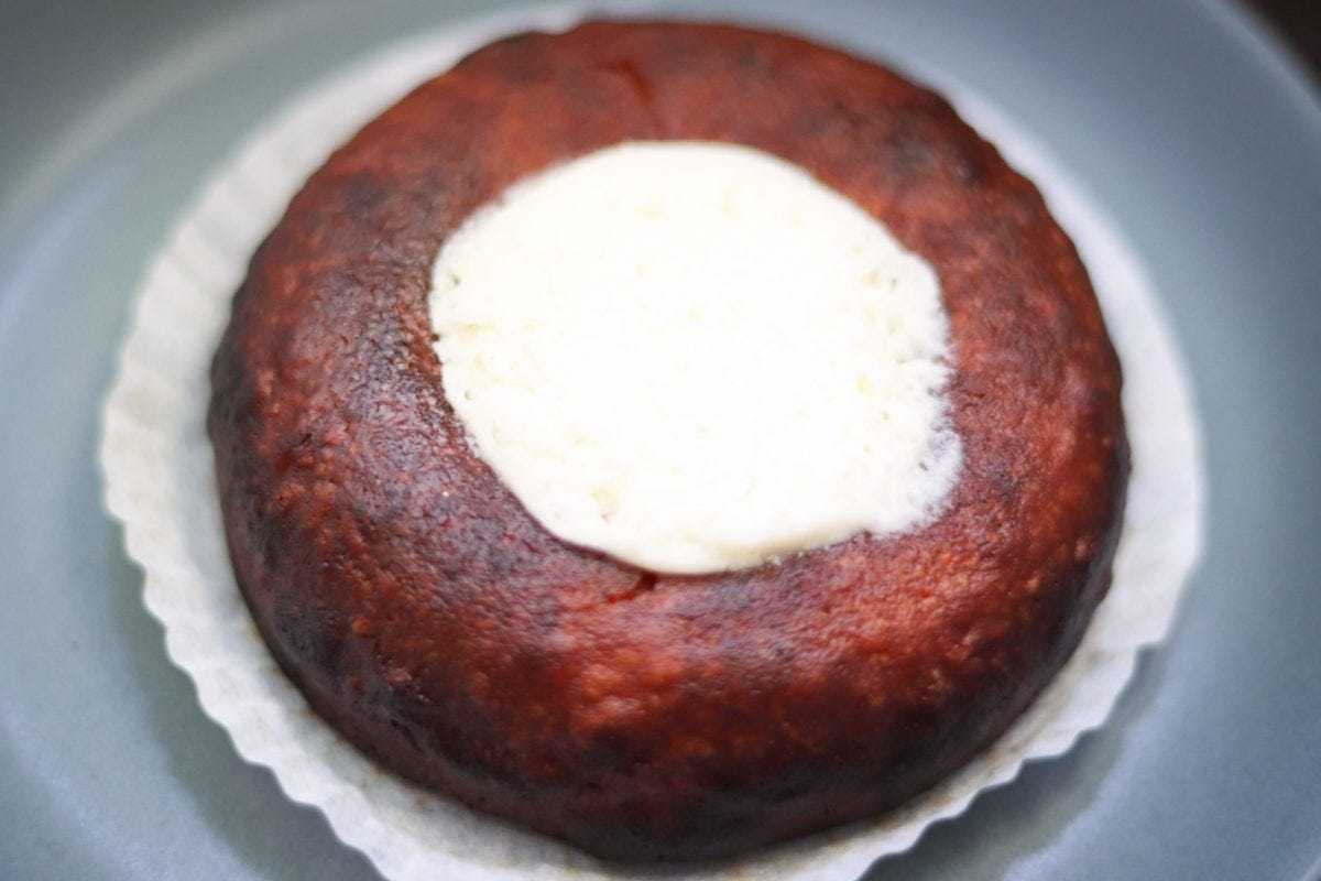 コゲ茶色と白のコントラストがあるビジュアルはかわいらしいが、肝心なのは味だろう。早速フォークを入れるともっちりとした感触でいい感じ。一口食べると、これは美味いぞ...!