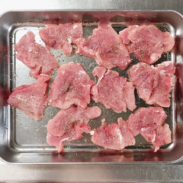 <4>下味をつけた豚ヒレ肉に片栗粉をまぶす。