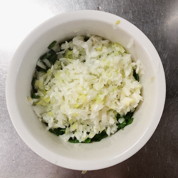 <2>長ねぎはみじん切り、にらは約0.5cm幅の粗みじん切りにする。