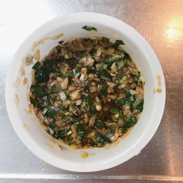 <5>盛りつけて、ねぎにらダレをかけたら糸唐辛子をのせる。