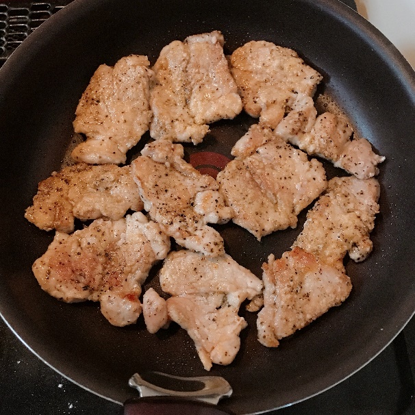 フライパンにごま油を敷き、中火にする。温まってきたら、豚ヒレ肉を入れて両面を焼く。