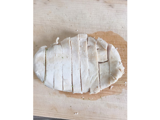 <1>豚ヒレ肉を厚さ約1cm幅に薄くスライスする。