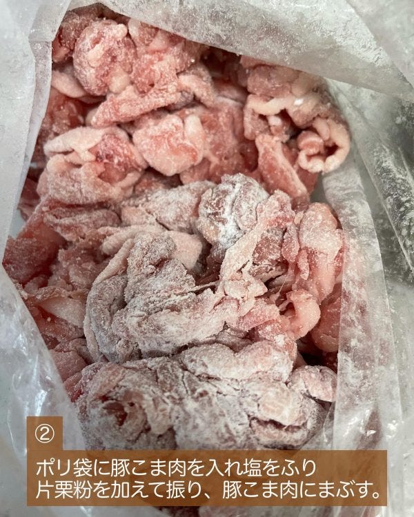ポリ袋に豚こま肉を入れ塩を振り片栗粉を加えて振り、豚こま肉にまぶす。