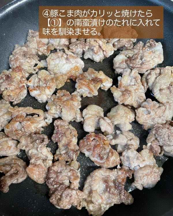 豚こま肉がカリッと焼けたら①の南蛮漬けのたれに入れて味を馴染ませる。