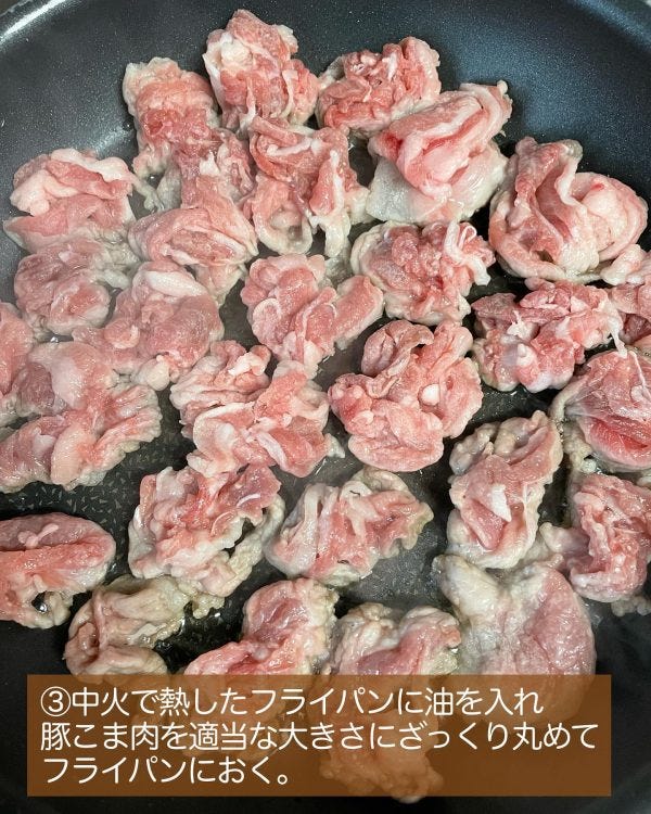 中火で熱したフライパンに油を入れ豚こま肉を適当な大きさにざっくり丸めてフライパンにおく。