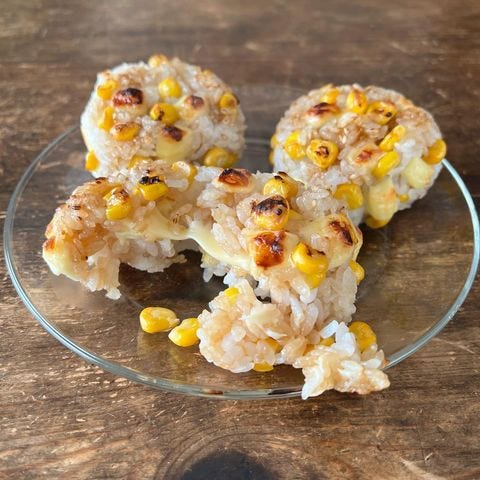 たっぷりのコーンとチーズを混ぜ込んだ焼きおにぎりのレシピです。