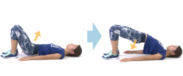 1. 写真左のように、仰向けになって膝を90度ほどに曲げてお尻を浮かせます。